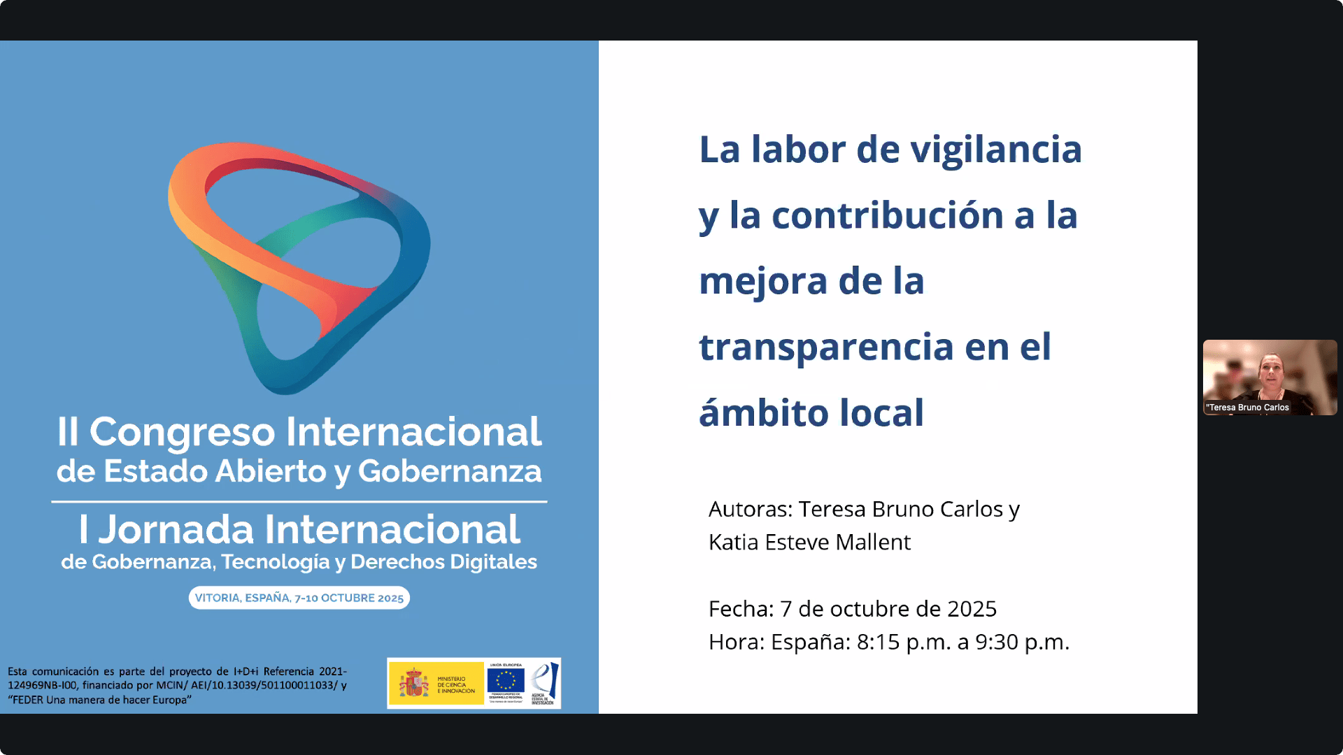 Por otro lado, las profesoras Katia Esteve y Teresa Bruno presentaron la comunicación “La labor de la vigilancia y la contribución a la mejora de la transparencia en el ámbito local” dentro de la mesa “Experiencias de gobierno abierto local”. En ella, abordaron la labor de los observatorios cívicos como agentes para la vigilancia de los poderes públicos y trataron el caso del Observatorio de Gobernanza, Transparencia y RSC en el contexto de la Comunidad Valenciana.